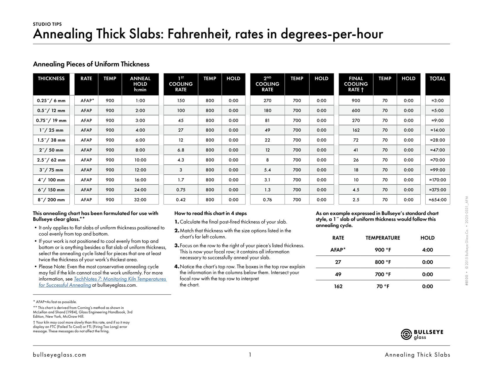 Bullseye’s Thick Slabs Annealing chart - This chart gives you your anneal and cooling segments for thick or textured projects. It replaces the last few cooling segments in any schedule starting at the anneal hold (the segment that holds at 900*F)