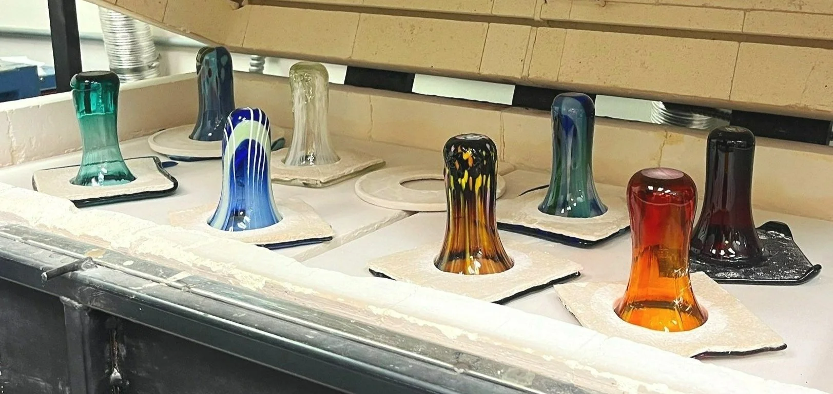 Standard kiln firings include: slumping, draping, fire polishing, tack fusing, soft fusing, and full fusing (mostly, anything up to 1525*F that takes less than 24hrs). Prices are determined by space, top processing temperature, and total firing time needed to fire your piece.
